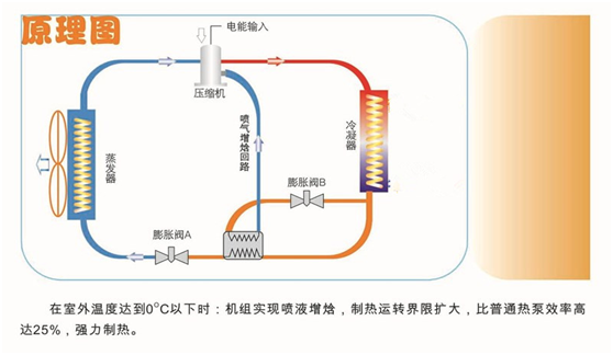 熱泵烘干機是一種新型節能烘干機,其工作原理是根據逆卡諾循環原理,采用少量的電能,利用壓縮機,將工質經過膨脹閥后在蒸發器內蒸發為氣態,并大量吸收空氣中的熱能,氣態的工質被壓縮機壓縮成為高溫、高壓的氣體,然后進入冷凝器放熱,把干燥介質加熱,如此不斷循環加熱,可以把干燥介質加熱至40℃~85℃。相對于電熱烘干機而言,節約了三分之二的電能。