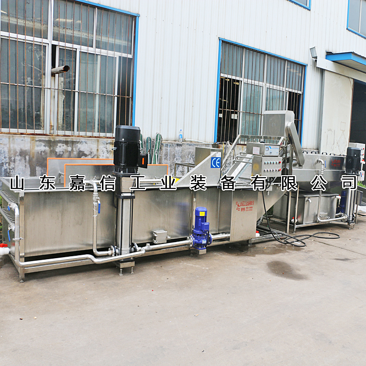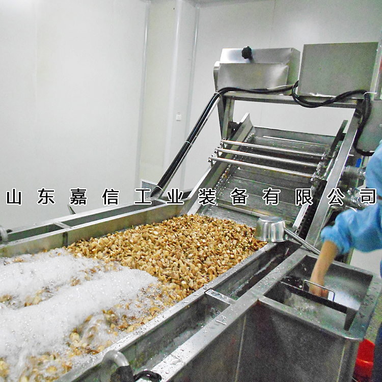該機有氣泡發生裝置,物料呈翻滾狀態,浸泡均勻。漂浮物可以從溢流槽溢出,沉淀物從排污口排出,,經噴淋清洗后,提升輸送到下道工序,介質水可過濾循環使用。清潔效率高,實用性強,節水節能,是清洗加工的理想設備。該機分為清洗翻浪段、二次清水噴淋段。