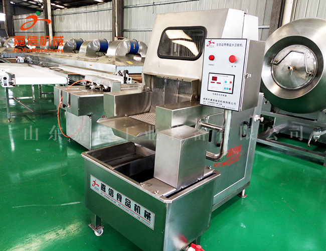 鹽水注射機是將鹽水及輔料通過鹽水注射、真空滾揉,注入肉中的料液充分腌漬,滲透,疏松肌肉組織結構,有利于肌球蛋白溶出,并且由于添加劑對原料肉離子強度的增強作用和蛋白等特點的調整作用,注入配制的水溶液能使肉質嫩化、松軟,從而提高了肉制品的出品率和改善肉制品的嫩度和口感。可根據不同工藝要求,調整步進速度,步進距離,壓肉板間隙及注射壓力,將腌漬液均勻連續地注入肉中,達到理想的注射效果。