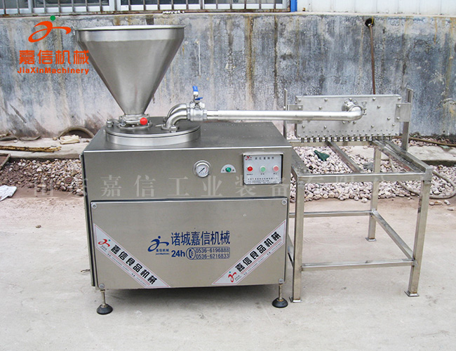 該機廣泛適用各種腸類制品的灌制。尤其對較干的料餡相對其他灌腸機效果更佳。該機上部設有貯料斗、碟形閥,可實現不掀蓋連續灌制,提高了工作效率。