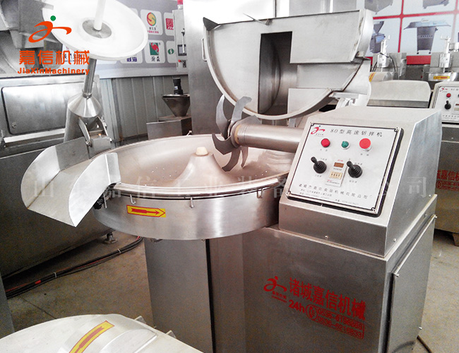 斬拌機利用斬刀高速旋轉的斬切作用,將肉塊,碎肉,脂肪等主要原料精細的斬切成肉餡或肉泥,同時將其它原料如水,冰片,輔料一起攪拌成均勻的乳狀物。斬刀高速旋轉,可以縮短運行時間,減少物料發熱量,保持餡料的天然色澤、彈性、出品率和產品的保質期。