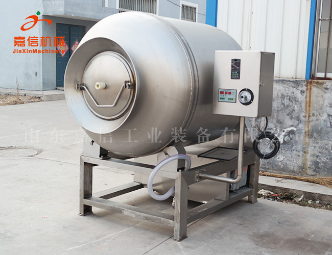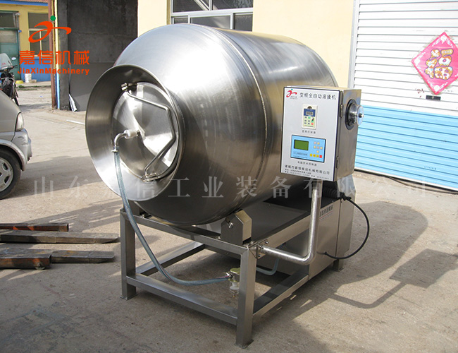 真空滾揉機是在真空狀態下,利用物理沖擊的原理,讓肉在滾筒內上下翻動,相互撞擊、摔打,達到按摩、腌漬作用,使肉均勻的吸收腌漬,提高肉的結著力及產品的彈性;本機具有肺呼吸功能,讓產品在滾筒內膨脹、縮小了往復運動,改善了肉組織的結構,提高了切面效果,增加了出品率。可以增強保水性,改善產品的內部結構。