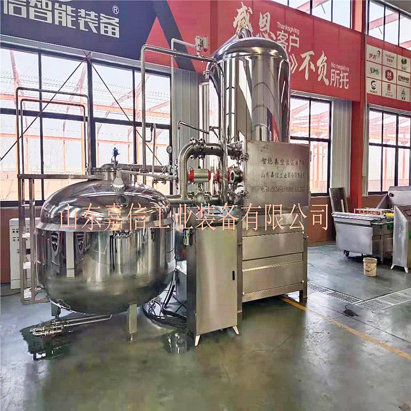 真空低溫油炸設備加熱方式采用蒸汽加熱。以蒸汽作為加熱介質,比較適合一定規模的工業化生產。其加熱器是螺旋盤管與夾套相結合,直接與炸油換熱。使用這一方式的特點是熱力足,特別是在炸品進入釜體以后炸油溫度下降較多時,加大蒸汽供應可以滿足加工時對熱量的需求。