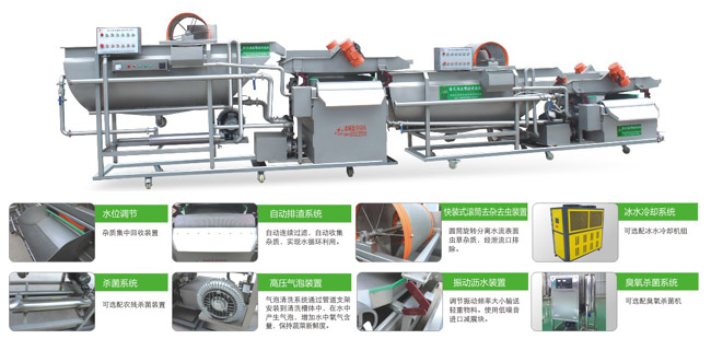 無阻擋缸體設計,避免物料清洗中的多次碰撞損傷;臭氧消毒系統,有效的去除果蔬殘留農藥及洗滌用品殘留物的毒性;自動補水設計,無需人工補水。