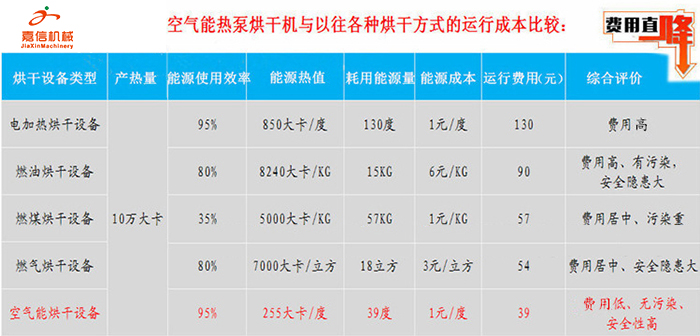 設備只需消耗少量的電能,可以在空氣中吸收大量的熱量,耗電量僅為電加熱器的1/4;同燃煤、油、燃氣烘干機相比,可節省70%左右的運行費用。1度電等于4度電。